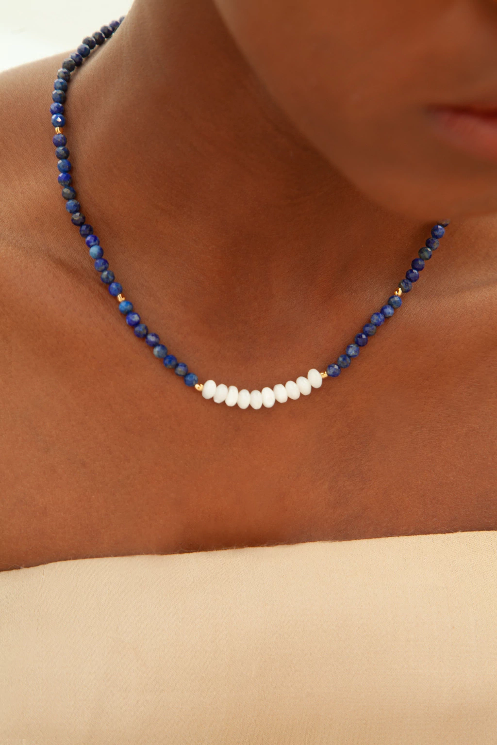 Encante-se com a sofisticação do Colar Luz da Lua, confeccionado com pedras naturais de lápis lazúli de 4mm e madrepérola, símbolos de sabedoria e pureza. O lápis lazúli é conhecido por despertar a intuição e a autenticidade, enquanto a madrepérola traz harmonia e proteção.